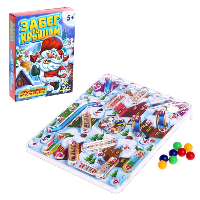 Возьмите вместо фишки шар и поставьте его на цифру 1, далее по очереди крутите стрелку: выпадет зелёный сектор – ходите на 1 ячейку вперёд, если синий – на 3, если жёлтый – на 4, если красный – на 6. Но по пути вас буду ждать испытания: попадёте на скат крыши – придётся скатиться вниз, если на лесенку – залезть по ней вверх. Выиграет самый быстрый и удачливый Дед Мороз!