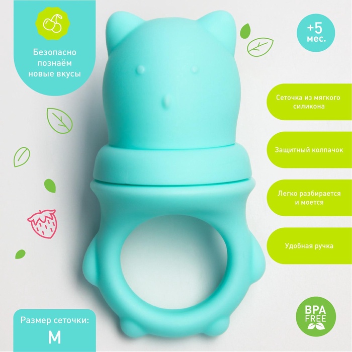 Изделие для прикорма (ниблер) пригодится в период, когда ребёнок переходит с кашки и молока на твёрдую пищу. Приспособление разовьёт у крохи жевательные навыки. Форма и размер силиконовой сеточки разработаны с учётом возрастных особенностей карапуза.