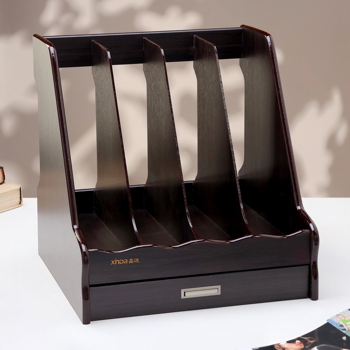 Этот подставка-органайзер помогает структурировать рабочее пространство. Открытые секции позволяют быстро находить нужные документы, а выдвижной ящик скрывает мелкие предметы. Такой подход способствует повышению эффективности работы и учебы.