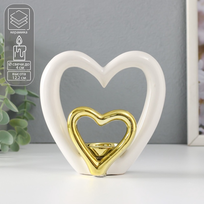 УЦЕНКА Подсвечник керамика на 1 свечу «Сердце в сердце» белое с золотом 12.7×5.5×12.2 см