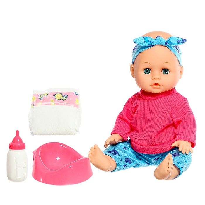 - В комплект входит бутылочка, подгузник и горшок. С этими аксессуарами ребёнок придумает множество весёлых игр.
