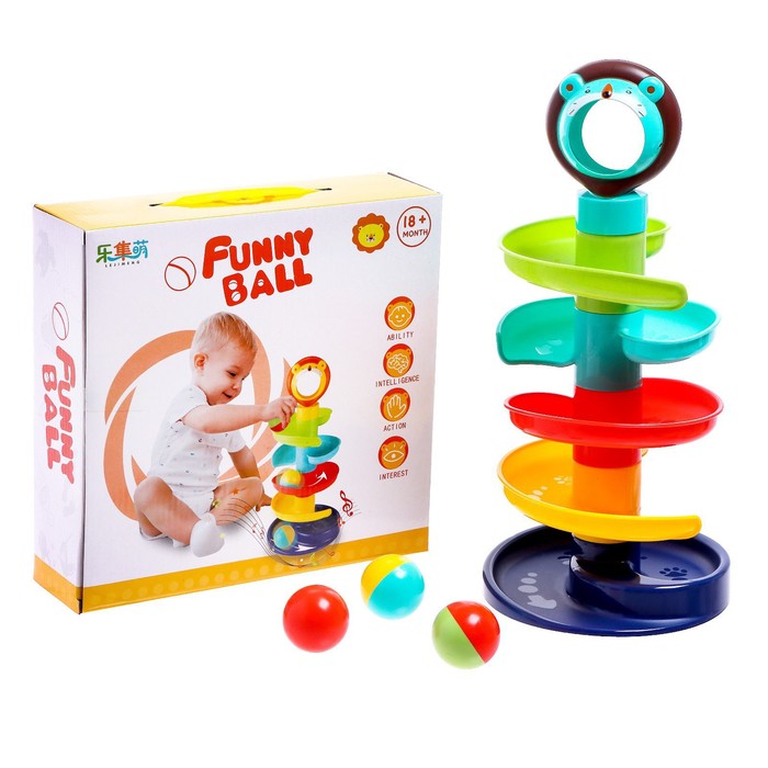 - Собранная пирамидка представляет собой спиралевидную горку, а с её вершины в виде львёнка можно катать шарики-погремушки.