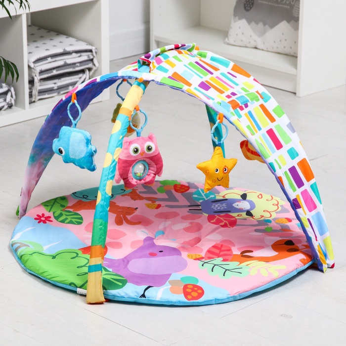 Малыш играет на спинке лёжа. На самом раннем этапе своего развития малыш тянется за яркими, притягивающими внимание игрушками и учится их хватать, так же малыш видит свое отражение в безопасном зеркальце и улыбается. В комплекте с ковриком прилагаются подвесные игрушки, яркие и привлекательные, они служат для развития тактильных ощущений и зрения.