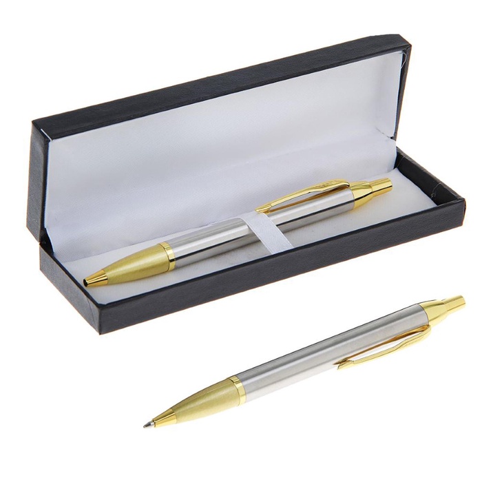 Ручка шариковая подарочная автоматическая в кожзам футляре "Модерн" серебристая с золотистыми вставками – продемонстрирует ваш безупречный вкус и подчеркнёт статус своего обладателя. Обтекаемый металлический корпус декорирован блестящими деталями, а футляр имитирует натуральную кожу.