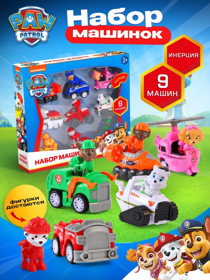 Собери всю команду Щенячьего патруля! Набор из 9 инерционных машинок — это коллекция транспортных средств любимых героев. Яркие цвета и узнаваемые персонажи делают набор идеальным для сюжетных игр.