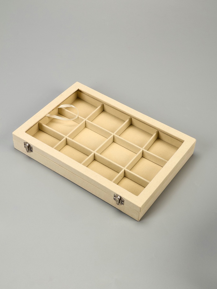 Элегантная шкатулка с 12 ячейками и прозрачной стеклянной крышкой — идеальное решение для аккуратного хранения украшений и мелких аксессуаров. Бежевая палитра в сочетании с мягким флоковым покрытием внутри создаёт атмосферу уюта и изысканности, позволяя бережно хранить ваши драгоценности и сохранить их первозданный вид.