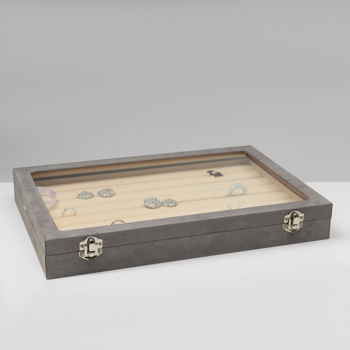 Комбинация стекла и текстиля обеспечивает надежную защиту и приятные тактильные ощущения, а продуманное разделение позволяет удобно разместить кольца и серьги, сохраняя порядок и облегчая поиск нужного аксессуара.