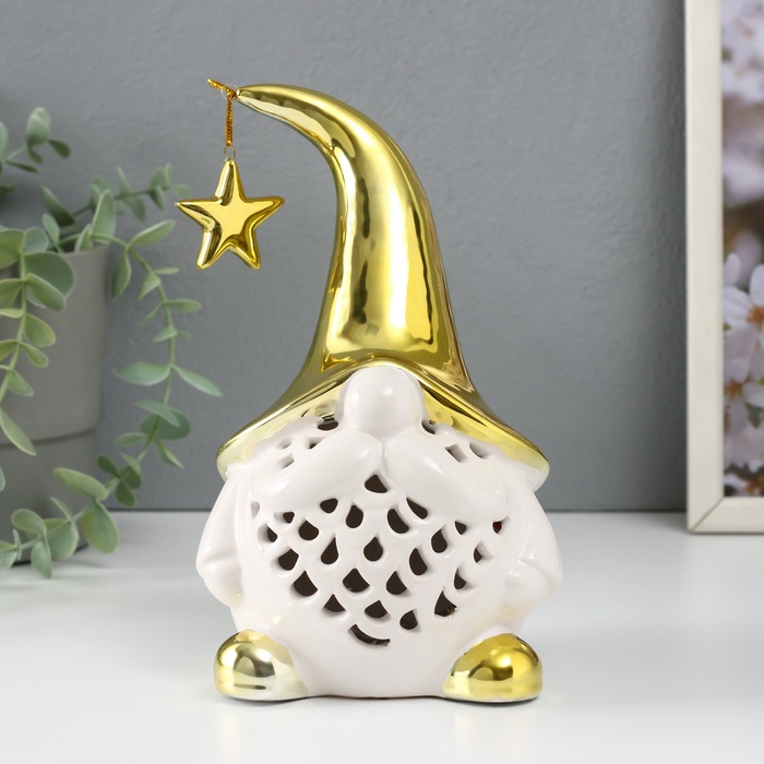 УЦЕНКА Сувенир керамика свет "Гном в золотом колпаке со звездой" белый 11,6х10,7х19,3 см