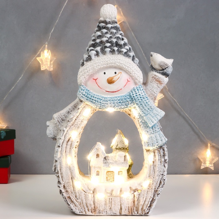 УЦЕНКА Сувенир керамика свет «Снеговик с птицей и зимним домиком, срез дерева» 41×25×9 см