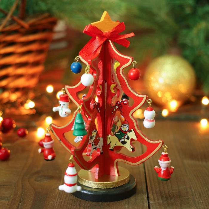 Симпатичные интересные подвески можно расположить по своему вкусу, а золотая звёздочка с красным бантом на макушке завершает тожественный образ лесной красавицы. Деревянная ель на подставке не замёт много места и будет радовать глаз в зимние праздники на протяжении многих лет.