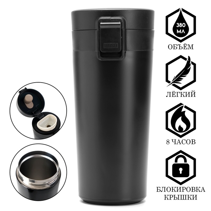 Термокружка сделана из нержавеющей стали марки 304, сконструирована по вакуумной технологии, с двойной стенкой, следовательно, долго держит тепло и не проливается. Снабжена откидывающейся крышкой, изготовленной из экологичного пищевого пластика, имеется кнопка с функцией блокировки, позволяющая с легкостью использовать термос одной рукой. На дне, термокружка имеет специальную прорезиненную основу, предотвращающую царапины на поверхностях.