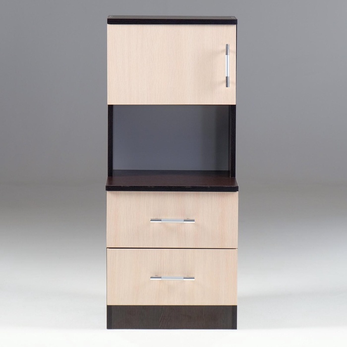 - Функциональность: Ящики, открытая ниша/полка и дверка обеспечивают разнообразные варианты хранения вещей, сочетая закрытое и открытое пространство.