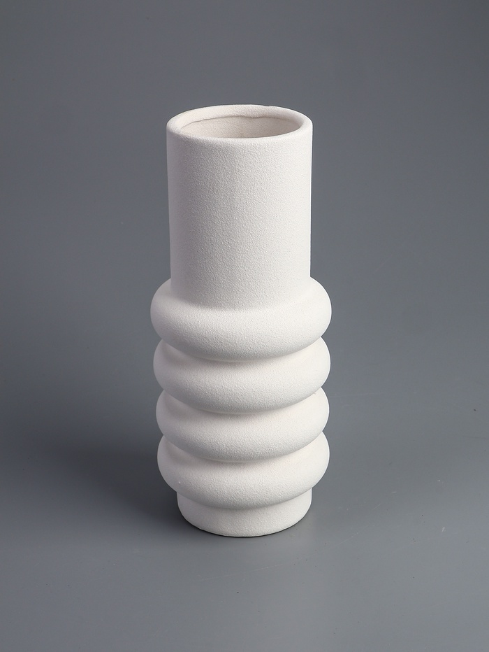 - Рельефный дизайн: Поверхность вазы не гладкая, а фактурная. Такой рельеф придаёт простой белой керамике визуальную глубину. Ваза интересна на ощупь и хорошо смотрится при естественном освещении.