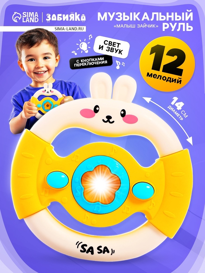 )Музыкальный руль «Малыш зайчик» — это яркая и увлекательная игрушка для малышей от 12 месяцев. Она станет отличным спутником в играх и поможет развить координацию, слуховое и зрительное восприятие. Жёлтый цвет и световые эффекты привлекают внимание, а звуковые функции делают игру ещё интереснее.
