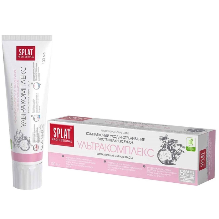 Зубная паста «Ультракомплекс» разработана SPLAT Professional для комплексного ухода за чувствительными зубами и их бережного отбеливания. Натуральный фермент папаин с компонентом Polydon® эффективно расщепляют налет. Инновационная система Sp.White System® безопасно отбеливает и полирует эмаль. Вытяжка из эфирного масла ромашки и ионы цинка обладают противовоспалительным действием и успокаивают раздраженные десны. Органический кальцис в сочетании с гидроксиапатитом эффективно укрепляют зубную эмаль, устраняя причину повышенной чувствительности зубов.
