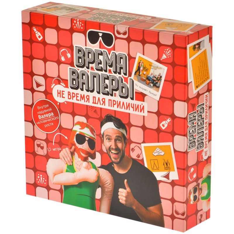 "Время Валеры" – это хитовая игра для вечеринок, в которой надо объяснять слова и фразы жестами и с помощью надувного Валеры. Вместе вы попадаете в странные ситуации: перевоплощаетесь в разных людей, разыгрываете сцены из фильмов или известные поговорки. Валера готов стать инструментом, предметом, животным – используйте его как угодно, лишь бы игроки назвали правильный ответ! Победит тот, кто после четвёртого круга наберёт больше всех очков за отгаданные слова.