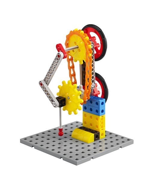 Набор включает в себя 181 деталь (шестеренки, колеса, оси, цепи, кубики, основание для кубиков и др.), а также инструкцию на английском языке.